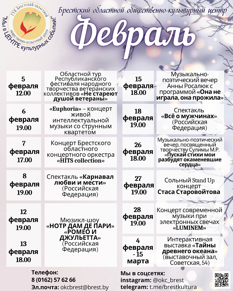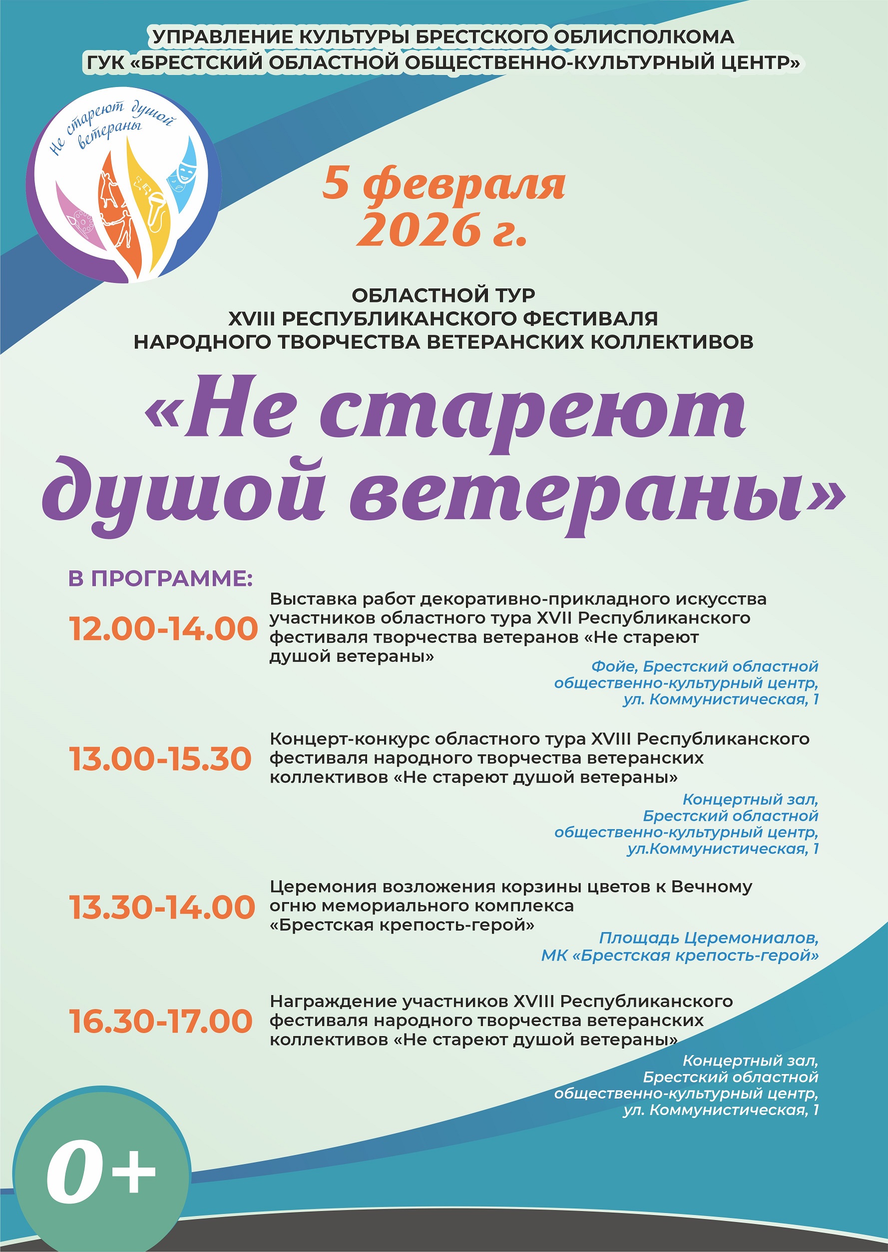 «Не стареют душой ветераны»: в Бресте пройдёт областной тур республиканского фестиваля народного творчества ветеранских коллективов. 5 февраля 2026 года Брест станет центром яркого культурного события – здесь состоится областной тур XVIIІ Республиканского фестиваля народного творчества ветеранских коллективов «Не стареют душой ветераны». Инициаторами мероприятия выступают управление культуры Брестского облисполкома и ГУК «Брестский областной общественно-культурный центр». Фестиваль ...«Тайны древнего океана»