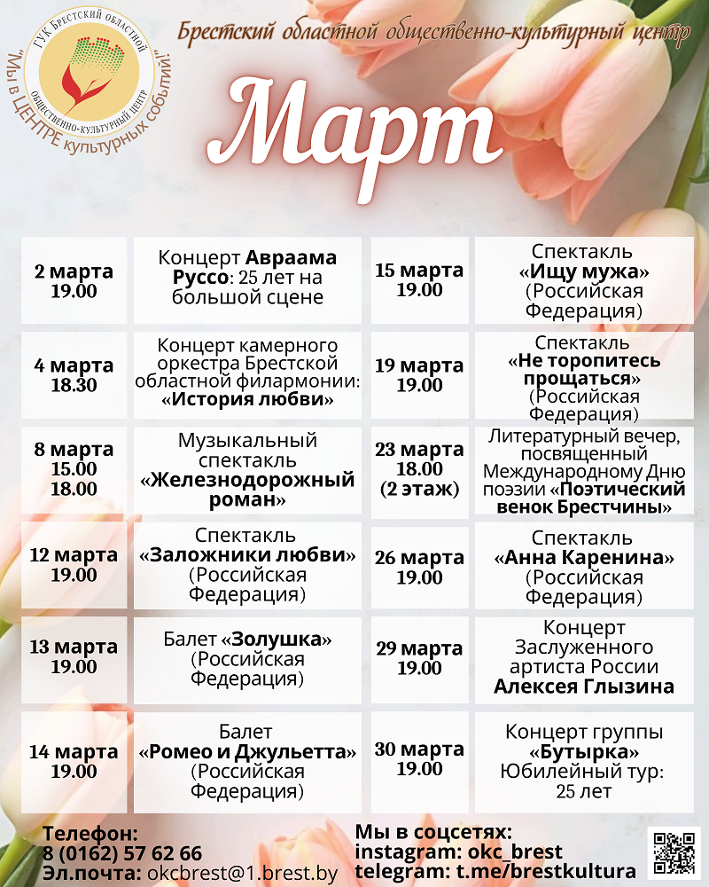 «С чувством. Искренне и горячо» Арт-проект «Усе разам+» в 2026 году состоится в тринадцатый раз. Ежегодная, ставшая традиционной выставка работ молодых художников Брестчины под рабочим названием «С чувством. Искренне и горячо», посвящена году белорусской женщины. ХІІІ выставка арт-проекта «Усе разам» имеет организационные изменения. Намек на это прослеживается под знаком «+». В ней принимают участие не ...Весенний концерт оркестра ко Дню женщин: музыка, пробуждающая душу