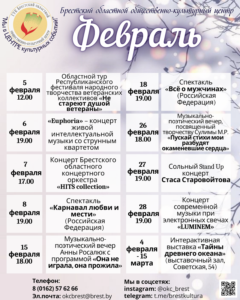 9 февраля сотрудники Брестского областного общественно-культурного центра приняли участие в организации торжественной церемонии открытия «Fonbet winter cuр 2026» с участием команд Республики Беларусь и Российской Федерации, которая состоялась в учреждении физической культуры и спорта «Государственный футбольный клуб «Динамо-Брест» . На мероприятии присутствовали заместитель председателя Брестского городского исполнительного комитета Виталий Щерба, заместитель начальника управления спорта Брестского ...В Бресте прошел областной тур XVIII Республиканского фестиваля народного творчества ветеранских коллективов «Душой не стареют ветераны»