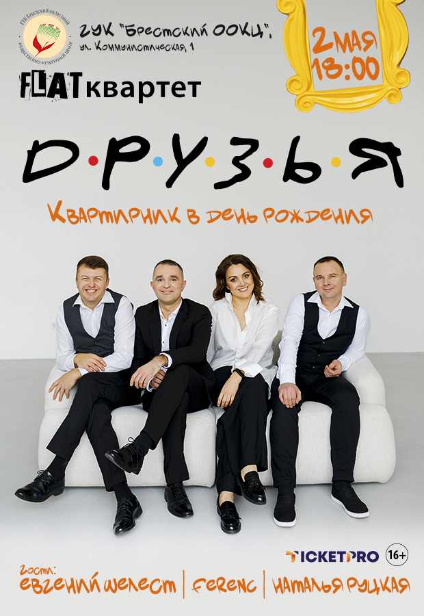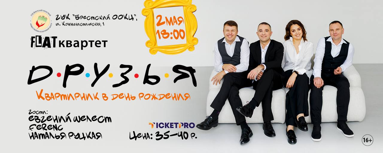 2 мая в концертном зале Брестского областного общественно-культурного центра группа «FLAT квартет» с программой «ДРУЗЬЯ». «ДРУЗЬЯ»- это мировые и отечественные поп и рок-хиты разных лет в тёплой, акустической обработке «FLAT квартет», а также авторские композиции участников концерта. «ДРУЗЬЯ» - это живое общение: шутки, любимые песни хором, смешные и романтичные истории из жизни, приятные воспоминания и ...Межобластной семинар-практикум для руководителей и специалистов областных методических центров народного творчества, районных центров культуры, клубных организаций Брестской и Гродненской областей