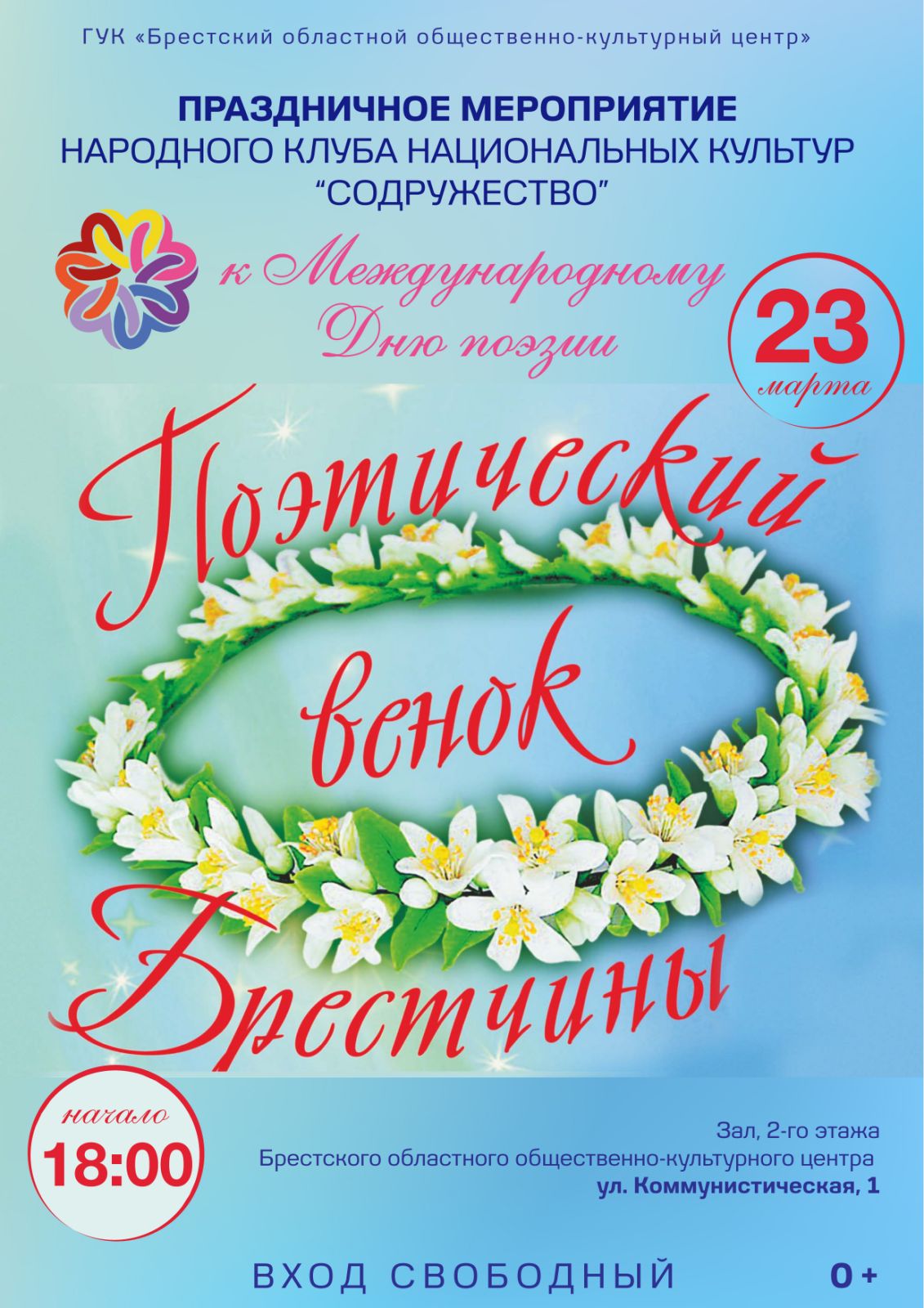 Народный клуб национальных культур «Содружество» отмечает свое 15-летие и приглашает на литературно-поэтический вечер, посвященный Международному Дню поэзии. Место проведения: г. Брест, ул. Коммунистическая, 1, ГУК «Брестский ООКЦ» зал 2-го этажа. Начало в 18.00. Download QR...Выставка молодёжного арт-проекта «Усе Разам+»