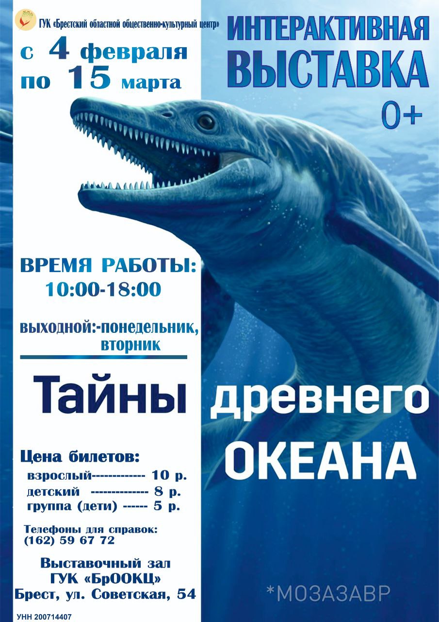 Приглашаем вас на познавательно-игровую выставку «Тайны древнего океана» С 04 февраля по 15 марта 2026 г. в выставочном зале ГУК «Брестский областной общественно-культурный центр» (ул. Советская, д. 54, г. Брест) будет проходить познавательно-игровая выставка «Тайны древнего океана». Откройте для себя «Тайны древнего океана» познавательно-игровую выставку, которая знакомит с могучими...