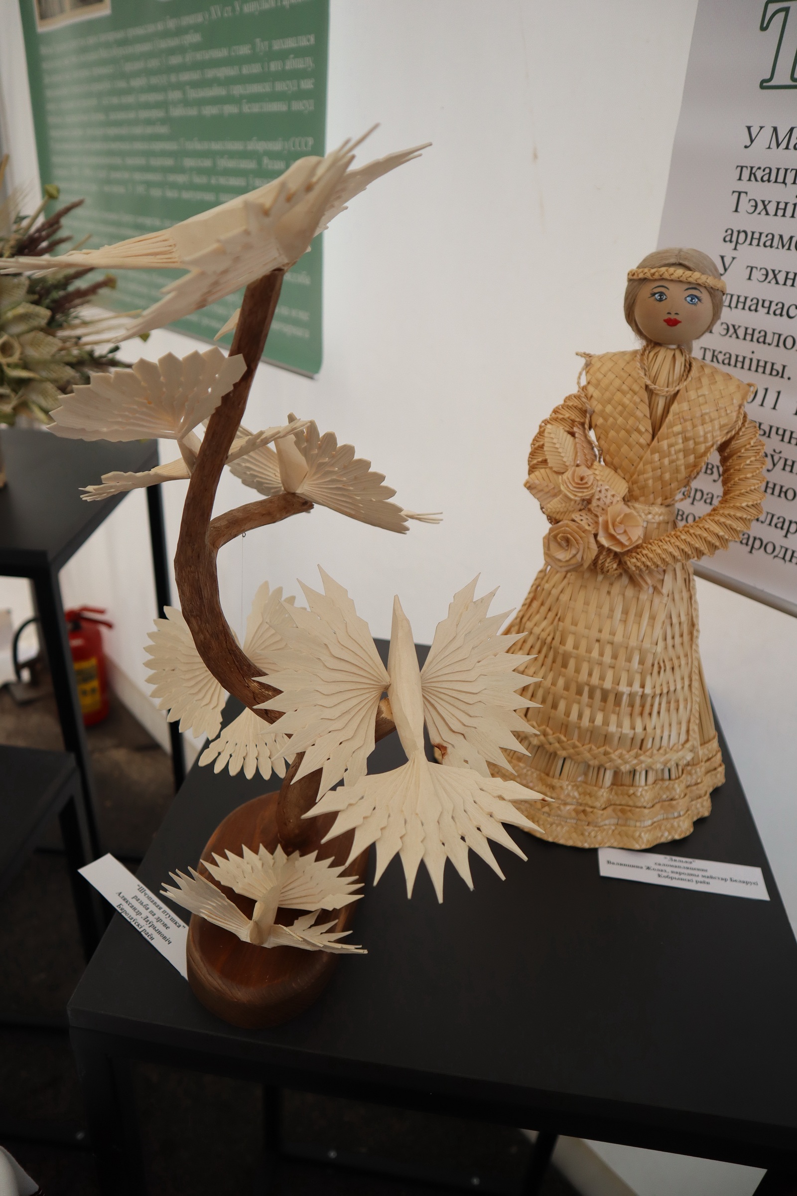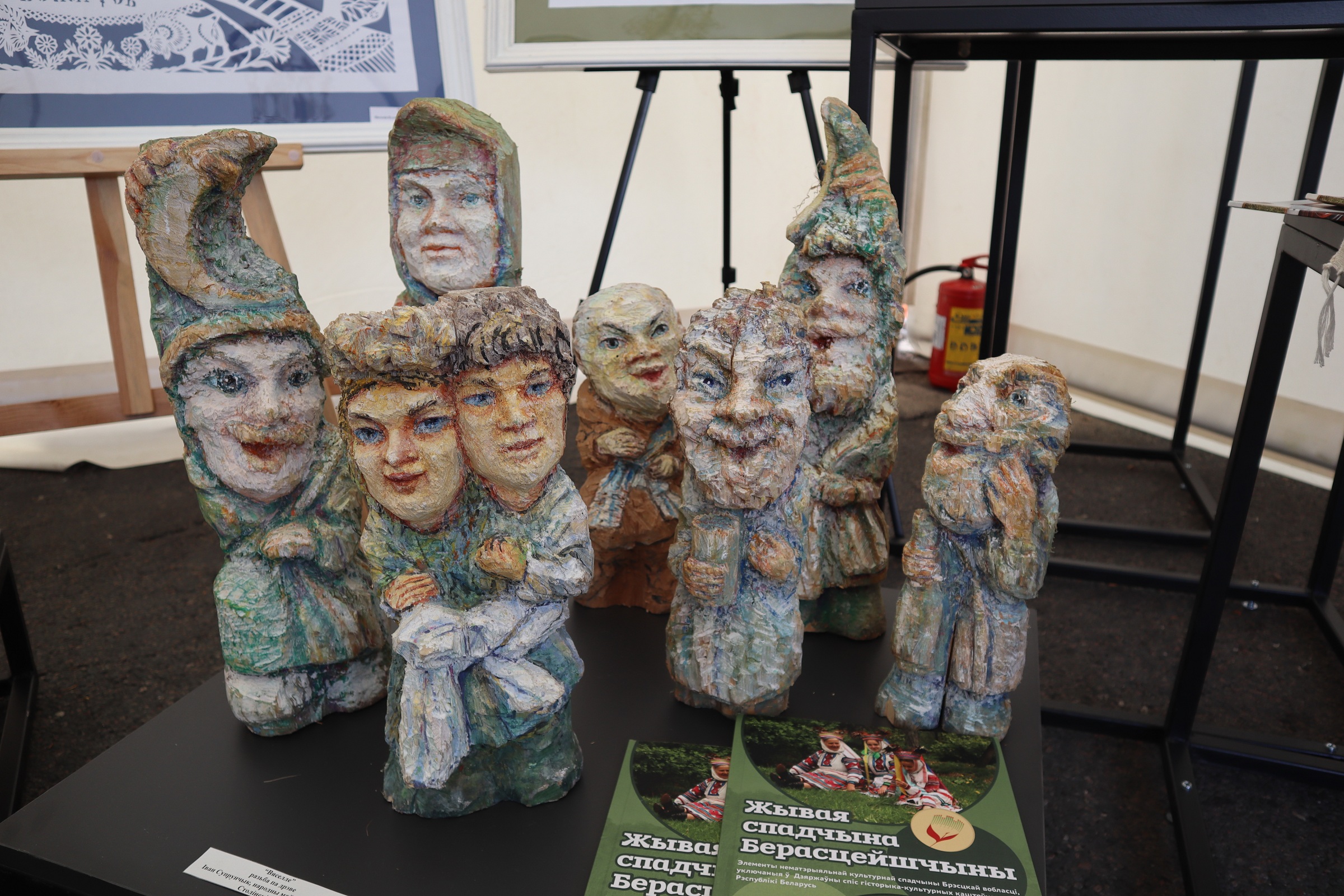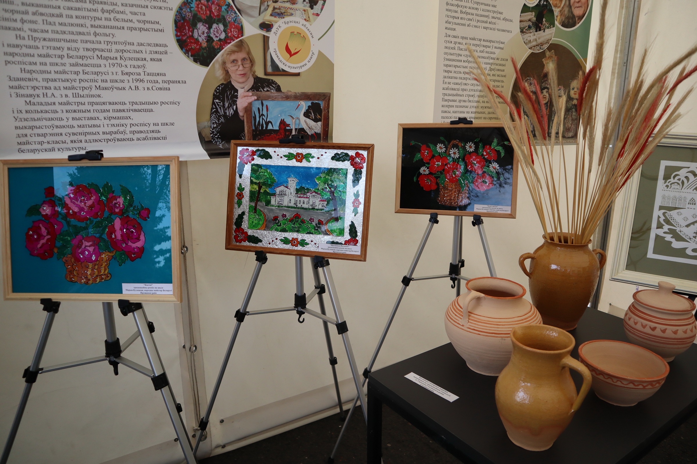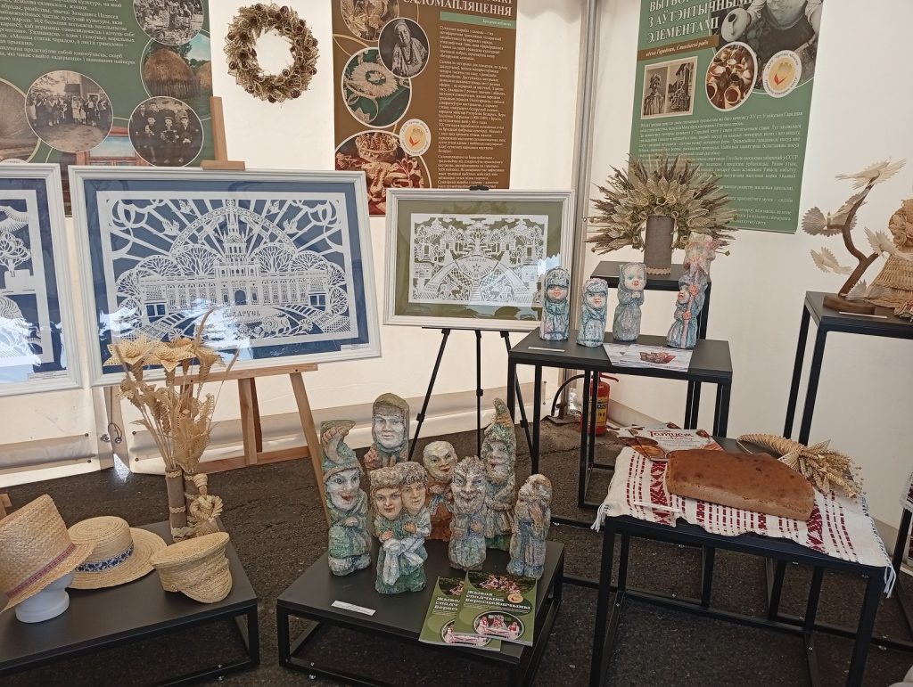 В экспозицию также вошли работы народных мастеров Валентины Струнец из г. Малорита и Валентины Готовчиц из д. Доропеевичи, которые демонстрировали традиционные для Малоритского района технику ткачества «кожушок» и выпечку гречневого хлеба, соломенные изделия народного мастера Светланы Стремоус из д. Дарево Ляховичского района, гончарные изделия из фондов Центра гончарства выполненные по старинным технологиям д. Городная Столинского района, деревянные скульптуры обрядового цикла народного мастера Ивана Супрунчика из д. Теребличи Столинского района, а также работы народного мастера Марии Кулецкой выполненные в технике росписи по стеклу пружанского региона и щеповая птица из фондов филиала «Центр детского творчества и народных ремесел» ГУК «Березовский районный Дворец культуры».
