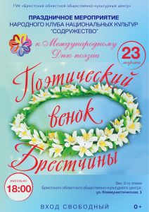 Народный клуб национальных культур «Содружество» отмечает свое 15-летие и приглашает на литературно-поэтический вечер, посвященный Международному Дню поэзии. Место проведения: г. Брест, ул. Коммунистическая, 1, ГУК «Брестский ООКЦ» зал 2-го этажа. Начало в 18.00.
